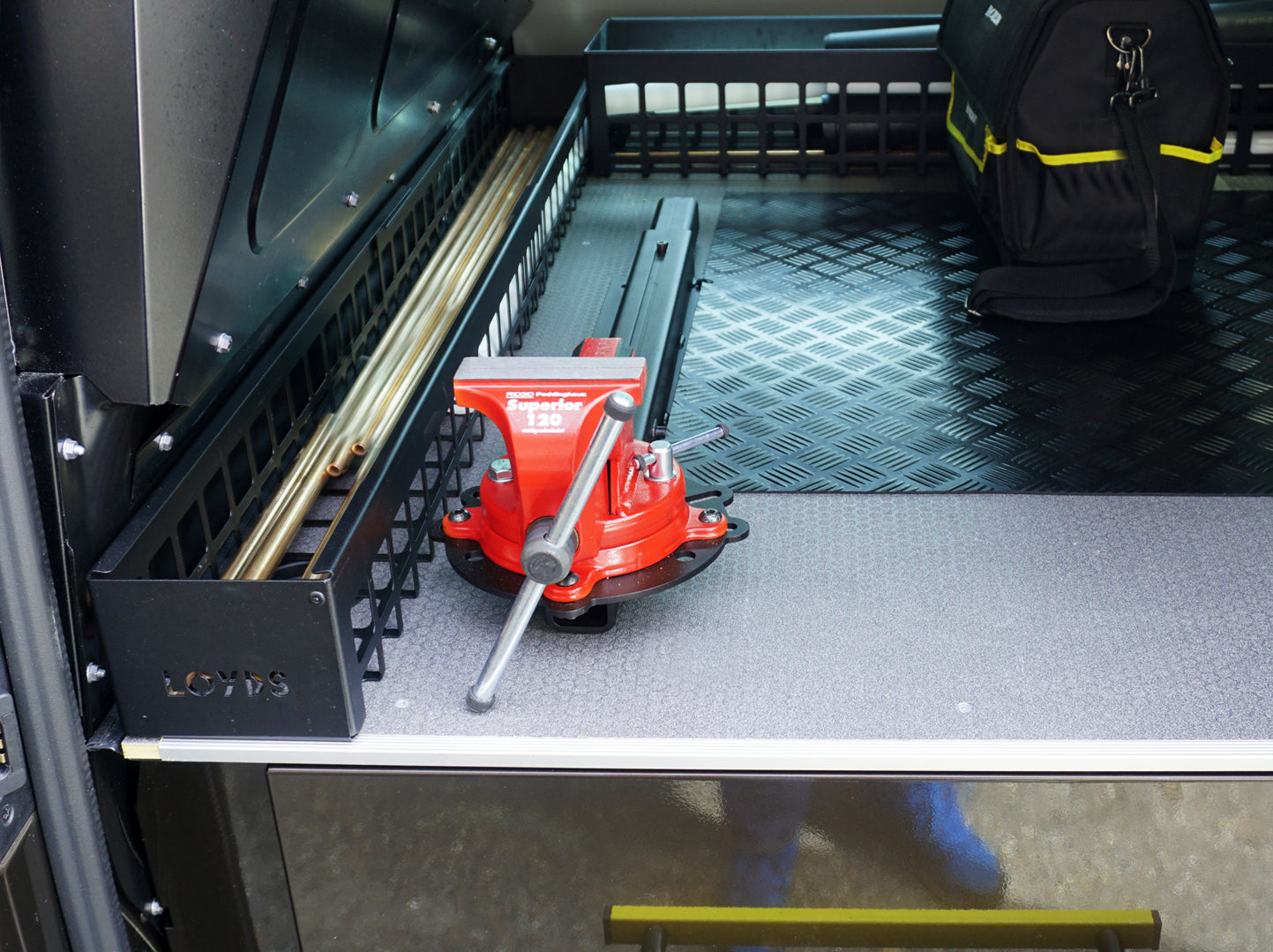 En egen boks til lange ting som samleskinner, bor, spett, kobberrør, skaft etc, som gjør at alle lange ting har sin faste plass på gulvet, og ikke blir liggende å skli rundt i bilen. Boksen har teleskopløsning og kan tilpasses alle bilmodeller. Monteres rett bak skilleveggen.