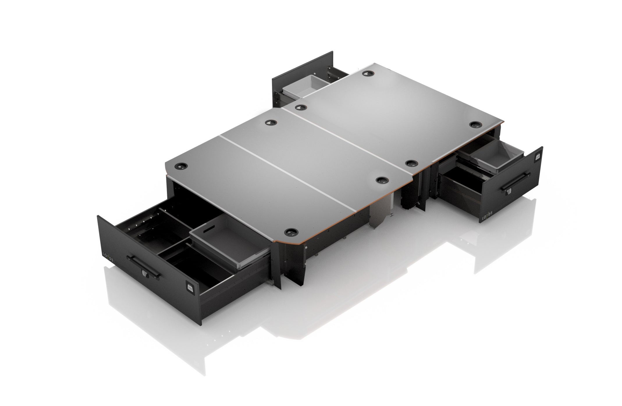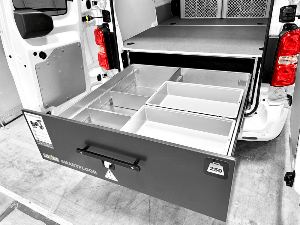 Med Smartfloor får du ekstra høye skuffer som rommer hele 1m3 og har en nyttelast på 500 kg. Du har alltid full oversikt over alt av verktøy og materiell som befinner seg i de store skuffene.