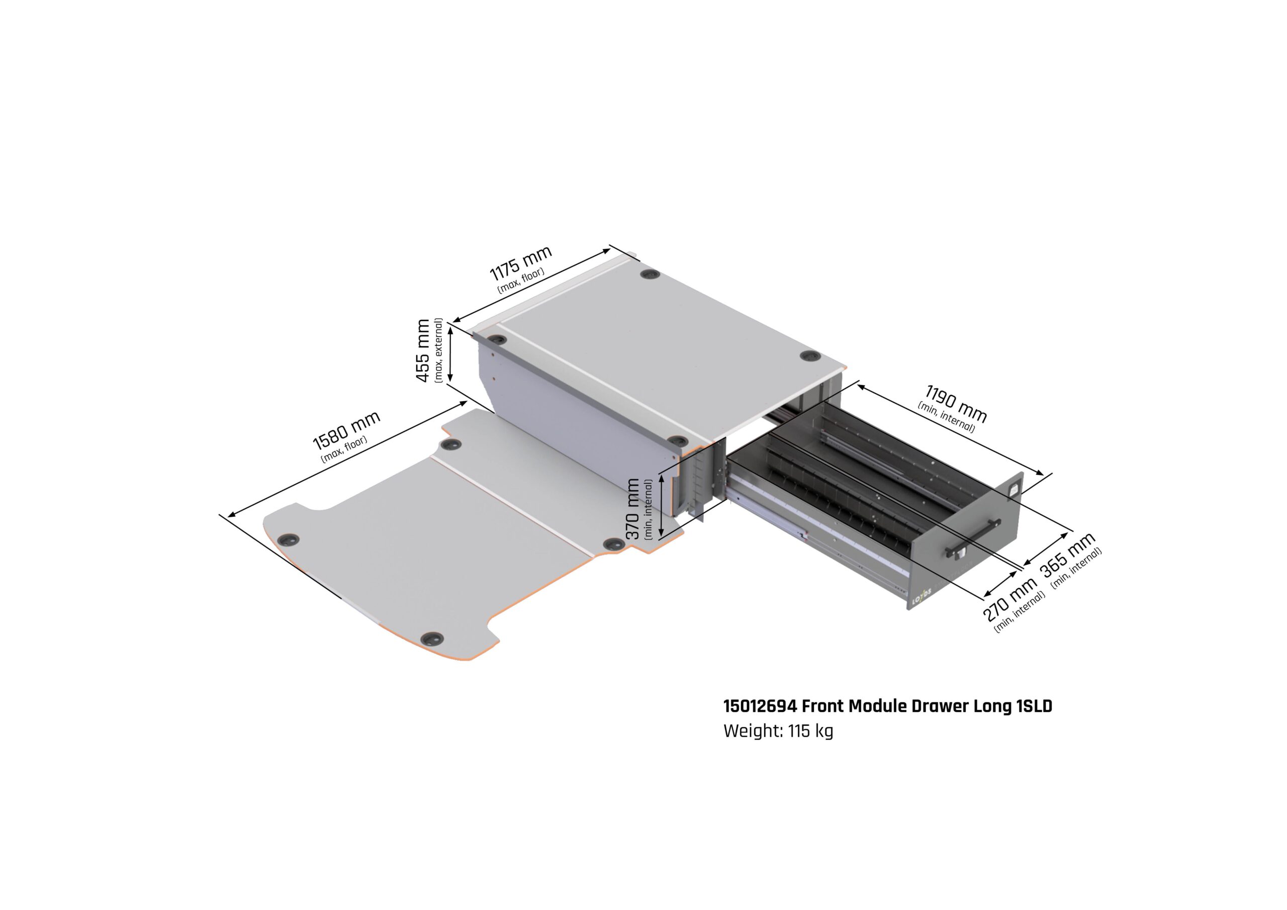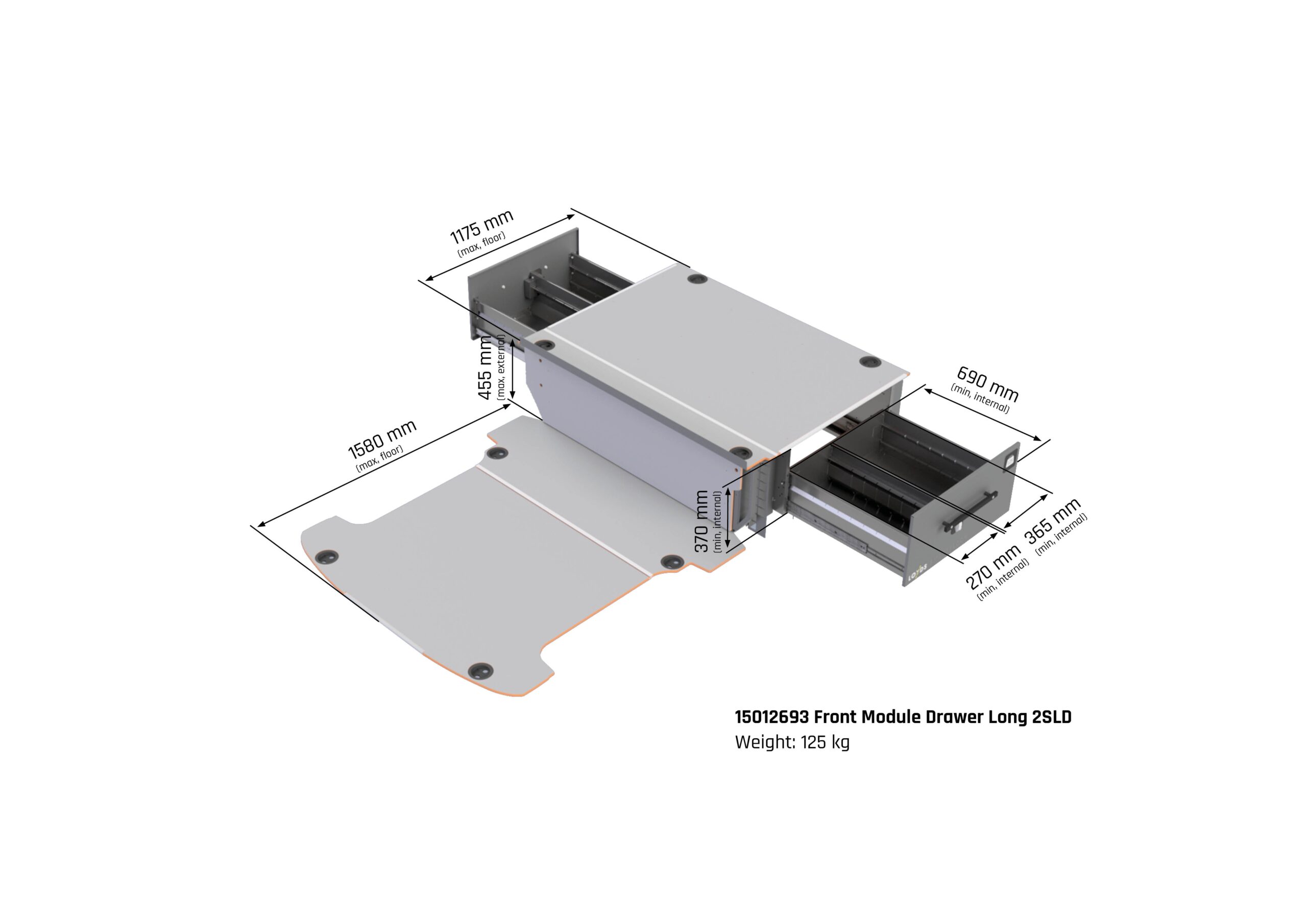 Med Smartfloor frontmodul får du ekstra høye frontskuffer som rommer hele 0,4 m3 og har en nyttelast på 250 kg. Du har alltid full oversikt over alt av verktøy og materiell som befinner seg i den store skuffen. Med denne løsningen til Volkswagen Transporter har du full høyde i bakre del av varerommet, til transport av ekstra høye varer og verktøy.