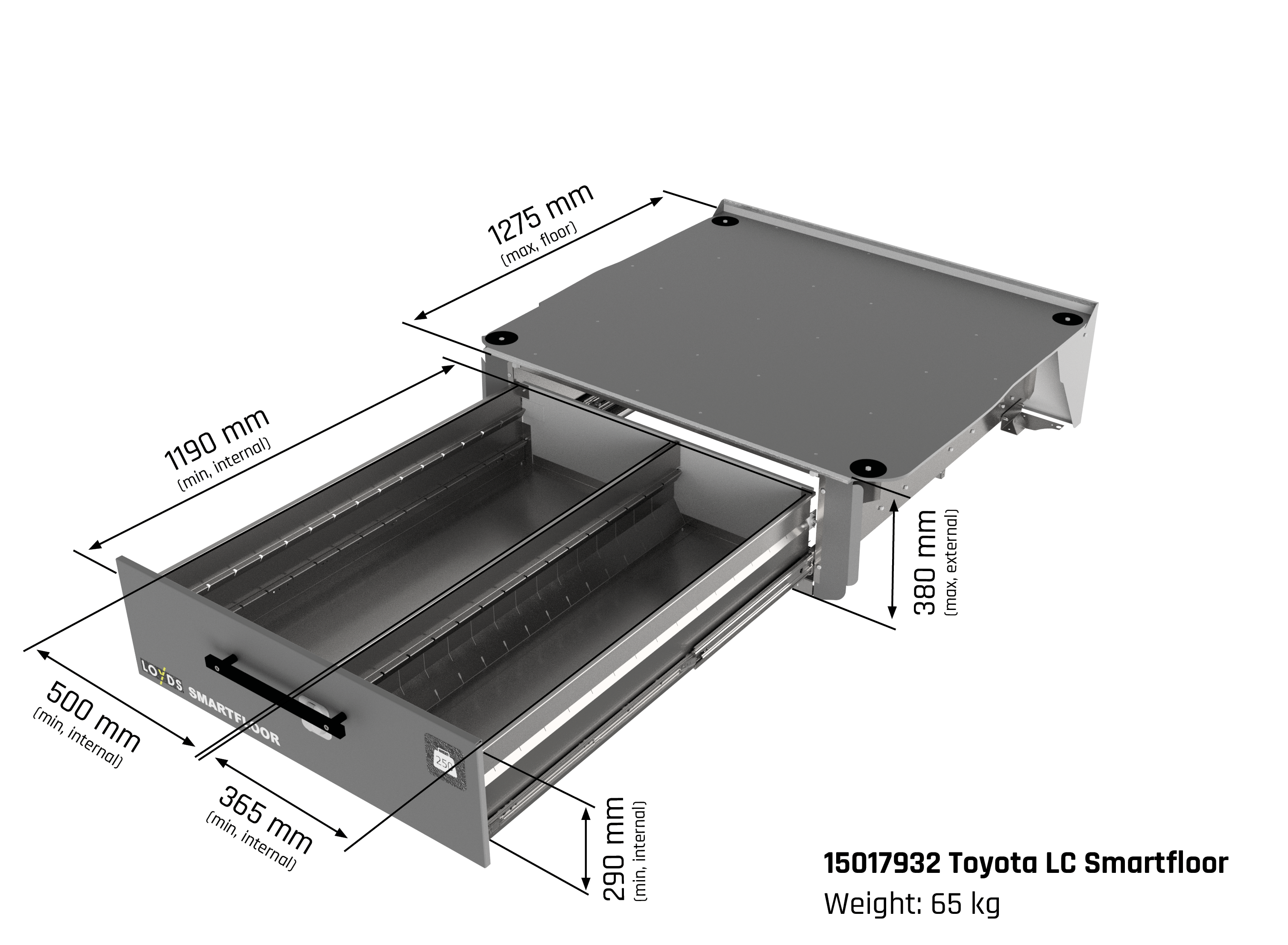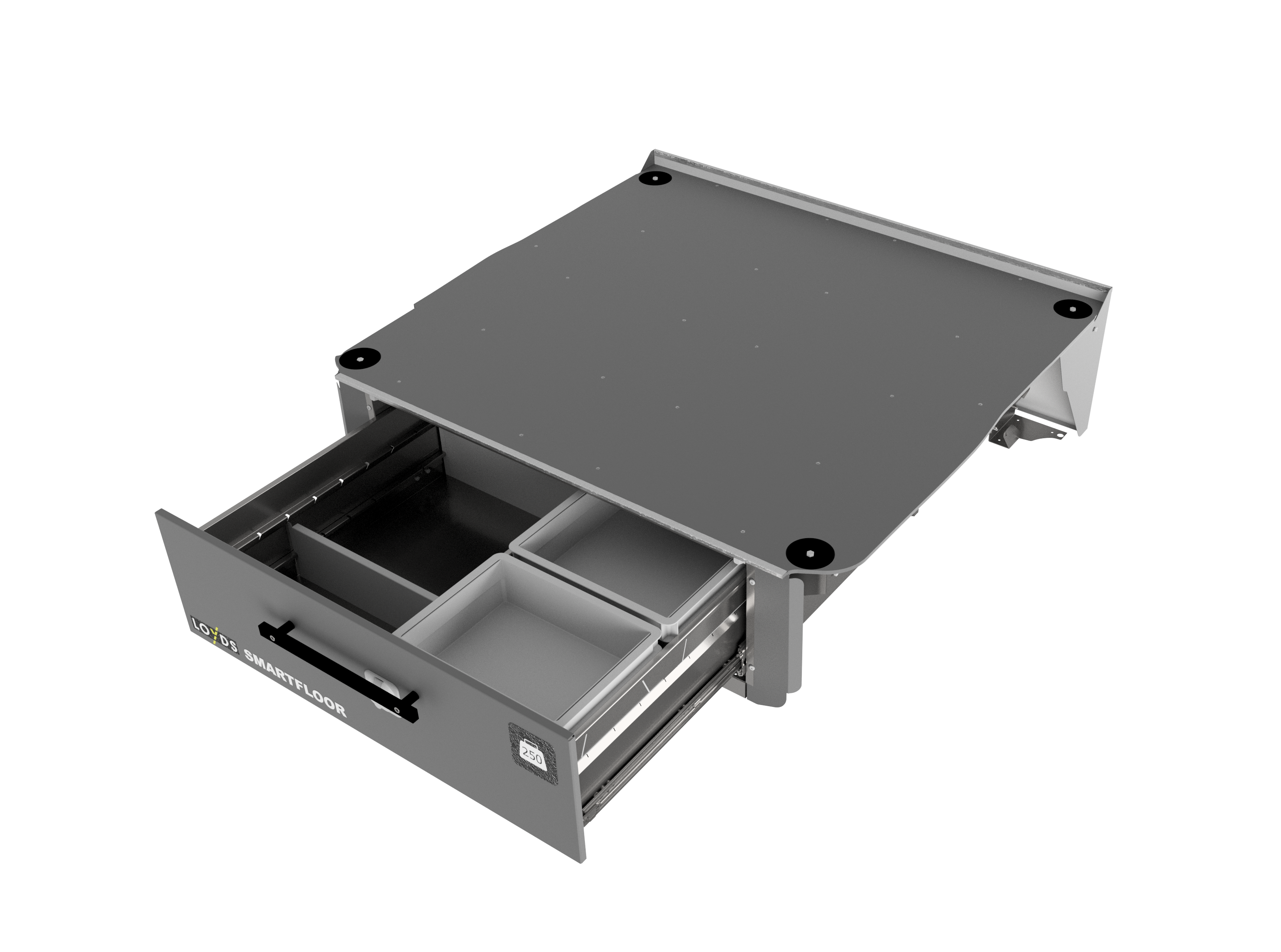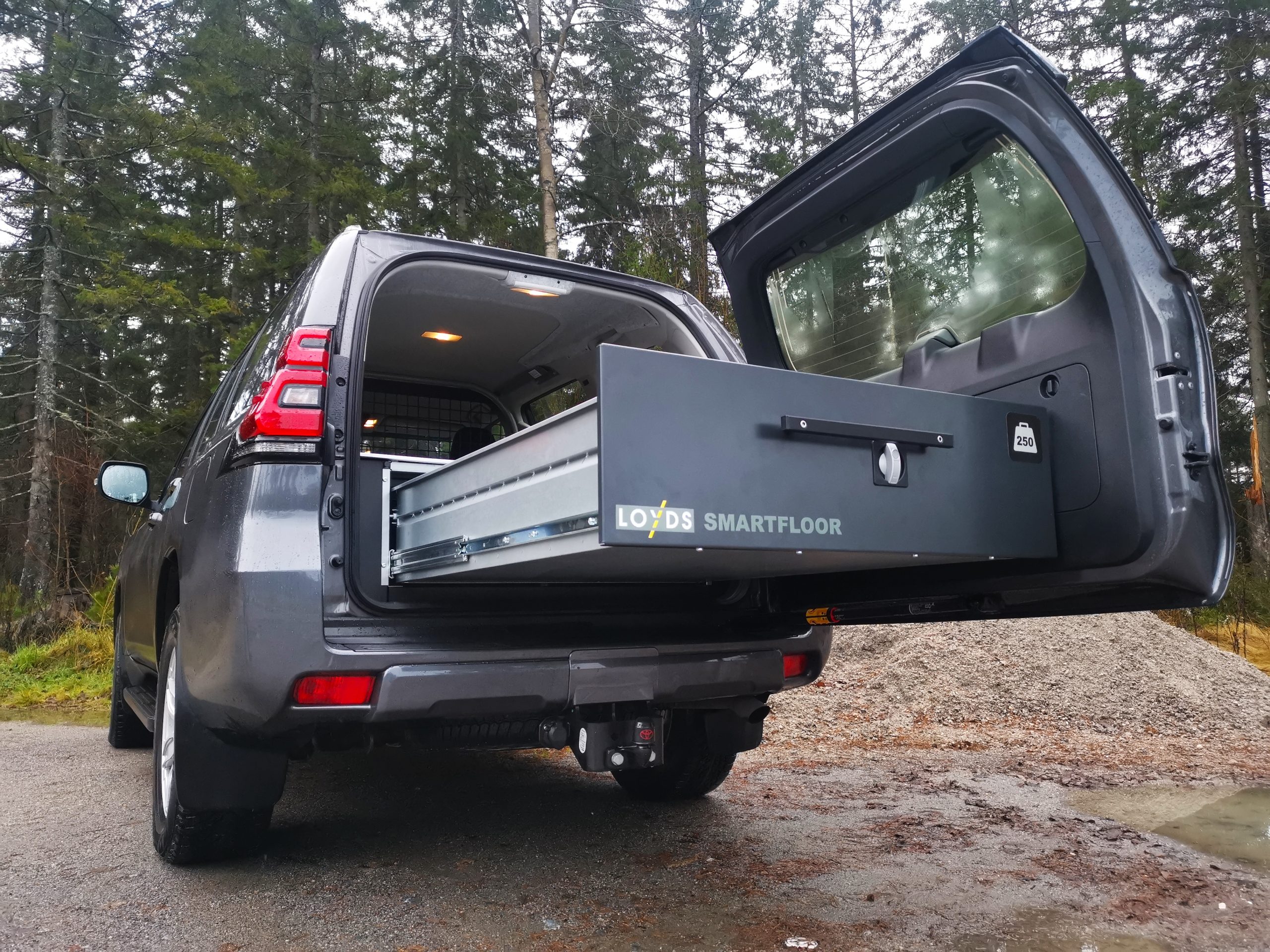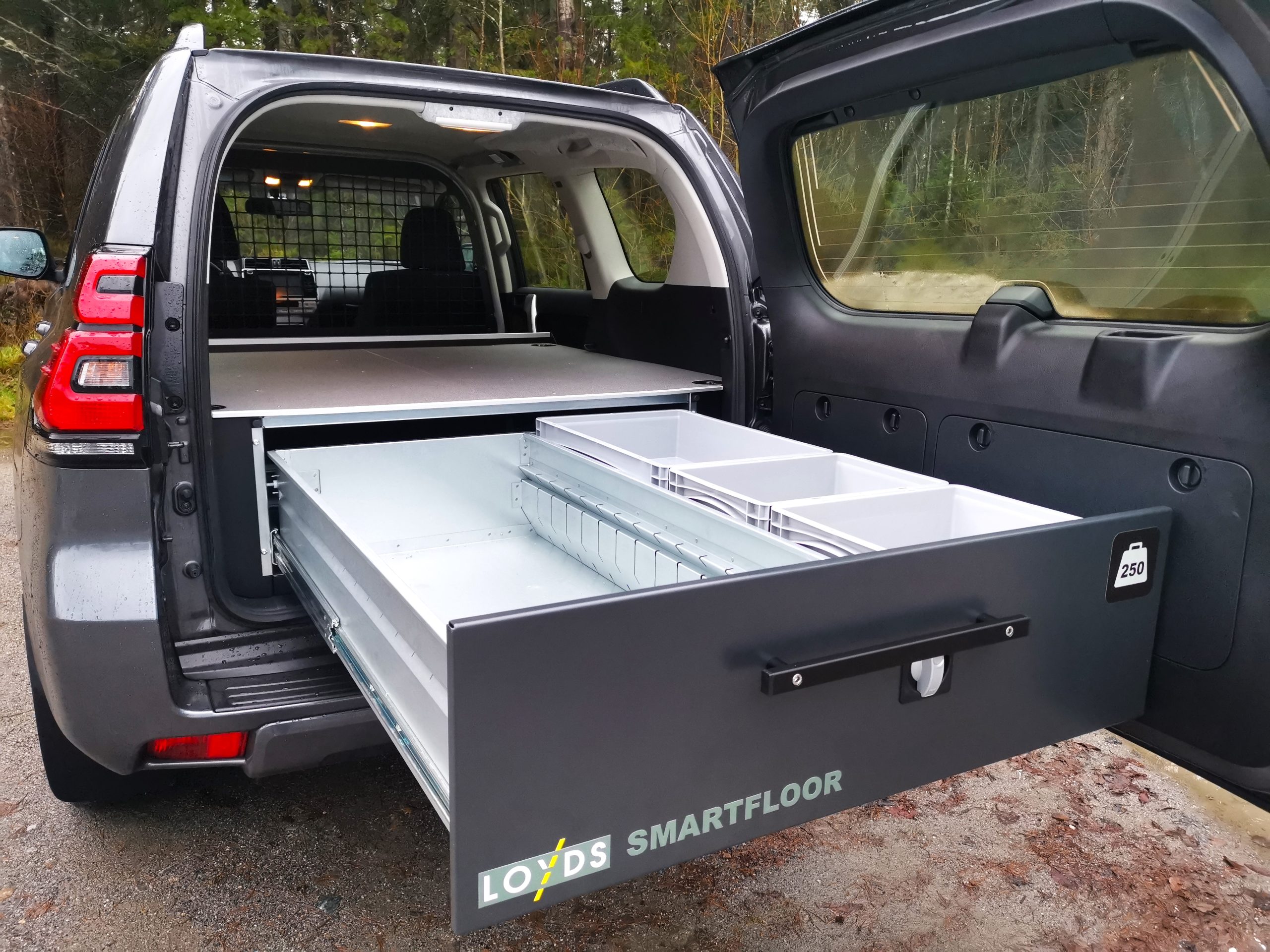Med Smartfloor til Toyota Land Cruiser får du ekstra høye skuffer som rommer hele 0,3m3 og har en nyttelast på 250 kg. Du har alltid full oversikt over alt av verktøy og materiell som befinner seg i de store skuffene.