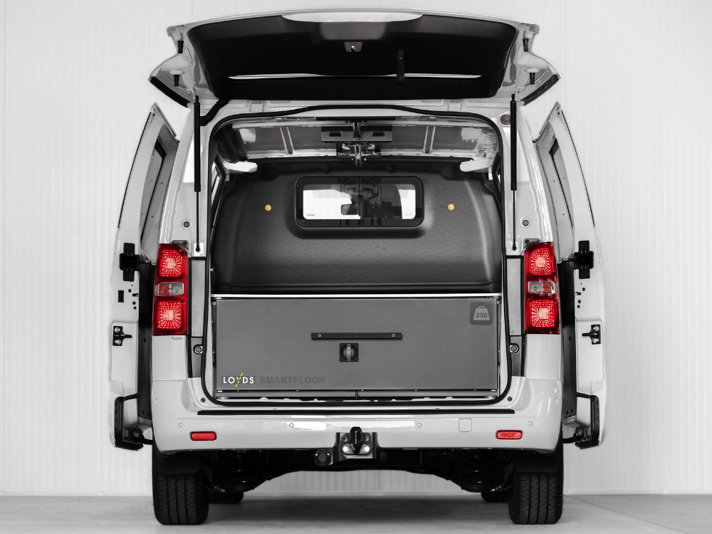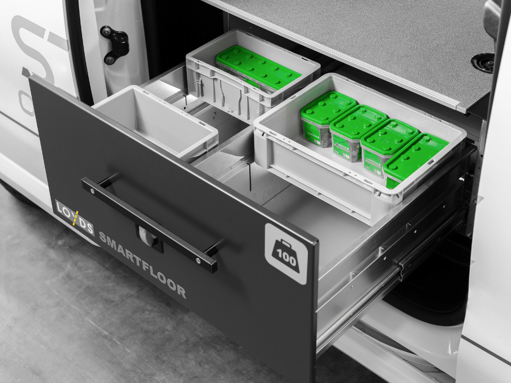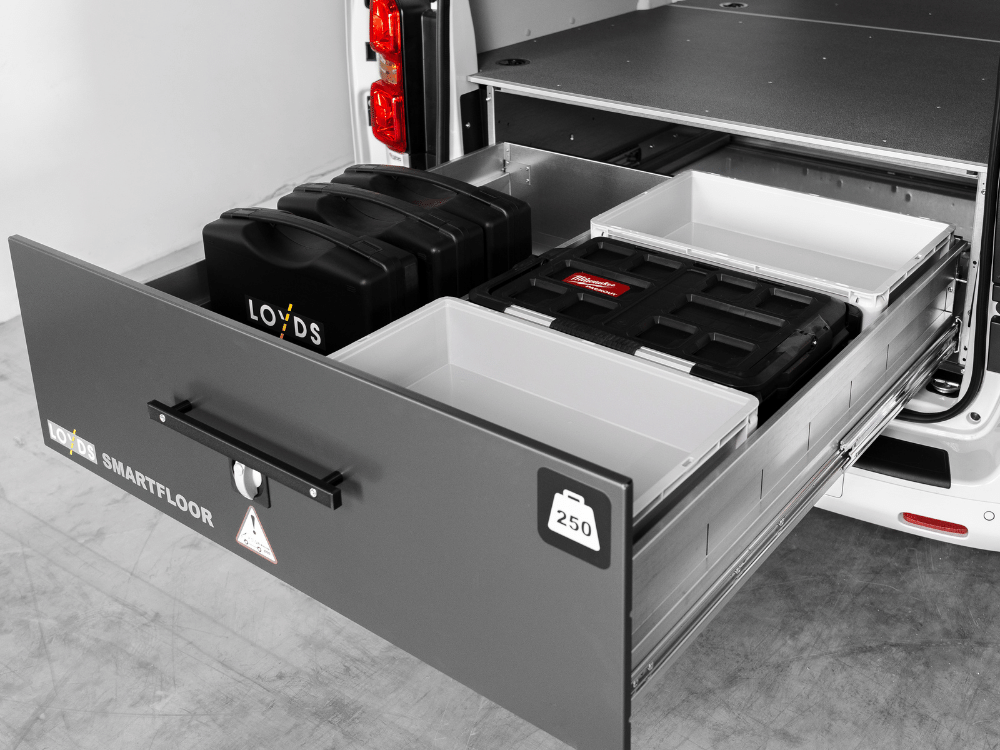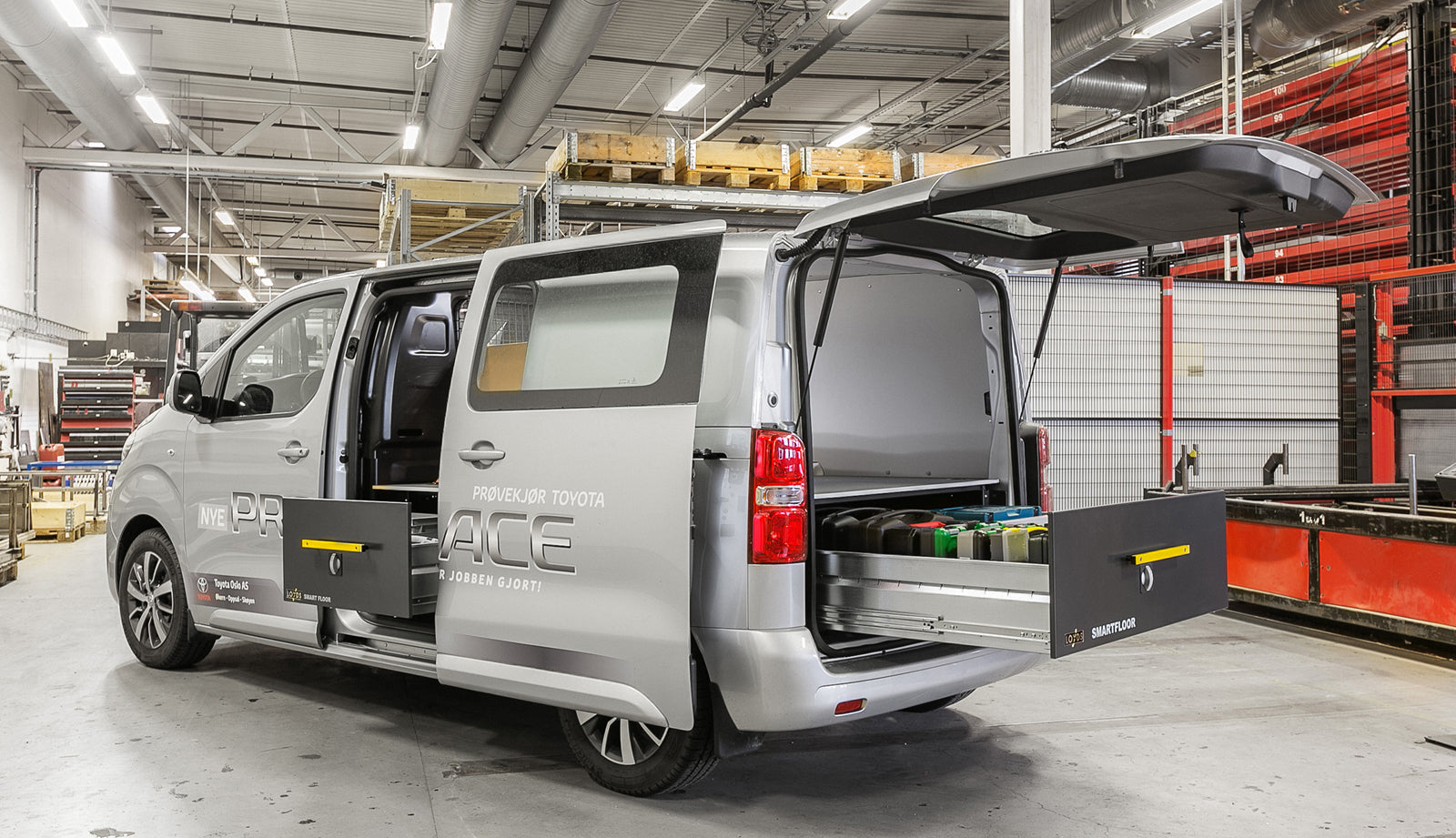 Med Smartfloor til Toyota Proace får du ekstra høye skuffer som rommer hele 1m3 og har en nyttelast på 500 kg. Du har alltid full oversikt over alt av verktøy og materiell som befinner seg i de store skuffene.