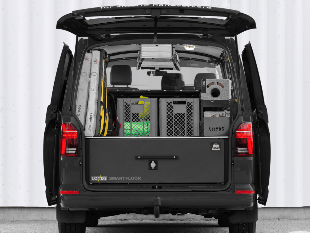 Med Smartfloor til Volkswagen Transporter får du ekstra høye skuffer som rommer hele 1m3 og har en nyttelast på 500 kg. Du har alltid full oversikt over alt av verktøy og materiell som befinner seg i de store skuffene.