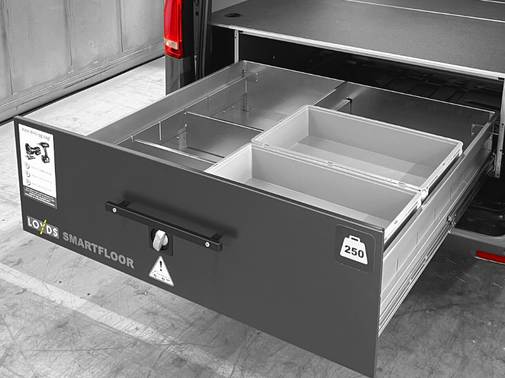 Med Smartfloor får du ekstra høye skuffer som rommer hele 1m3 og har en nyttelast på 500 kg. Du har alltid full oversikt over alt av verktøy og materiell som befinner seg i de store skuffene.